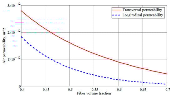 where these models parameters are: , , and μm is a fiber radius. The validity of the relations (16) is confirmed by numerous experimental data for different CFRP and GFRP (Glass Fiber Reinforced Plastic) fabrics, e.g., [52,53]. These dependencies are present in Figure 11. A comparison of Figure 10 and Figure 11 demonstrates a very close coincidence of the nature of permeability for liquid and air; therefore, the dependence of permeability for both contacting phases is assumed to be the same, and it was calculated by the Formula (11).