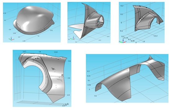 Due to the above-mentioned improvements while ensuring a low degree of the resin cure at the end of the preform filling [13,15,16,17,18,19,20,21] they were successfully implemented in the manufacture of aircraft structures (usually shell type) [1,22,23], blades of the wind turbines [1,20,24,25,26,27], ship’s hulls [1,2,20,24,25], details of spacecraft [1,28], large-sized parts of cars bodies [29,30] and in the defense industry [7,27].