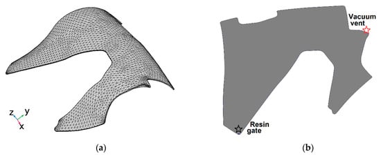 In the fundamental work [36], the modeling approach that was used to describe the resin flow process is based on the FE/CV method. The modeled part’s geometry was assumed as shell-like, the thickness of which is much smaller than other dimensions. This approach was implemented in almost all later works [10,25,27,38], including the most recent ones [5,16,20].