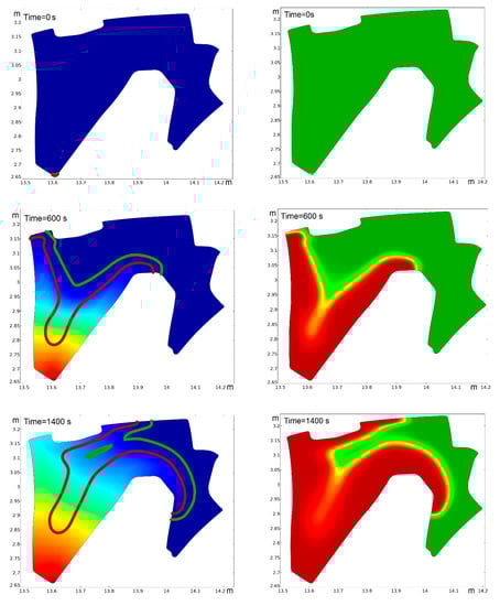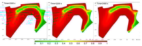 where n is unit normal to the vent surface Σ. Figure 15, Figure 16, Figure 17 and Figure 18 illustrate the changes in process infusion state at time interval 2000–2400 s. This time interval is noted by the cross markers on the time axis.