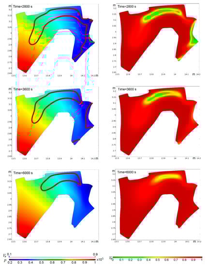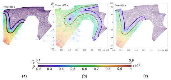 Some snapshots of the resin volume fraction and driving pressure distribution in the preform during model simulation are shown in Figure 14. The left column of this Figure shows the plots of the resin pressure distribution in the preform combined with the lines of two Vr levels: 0.1 and 0.9, whereas the right column contains the resin filling Vr distribution plots at the different time instants. Several important features of the simulation can be identified when considering these images.