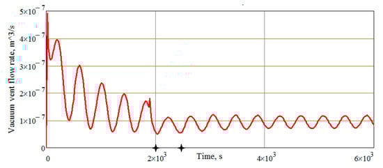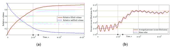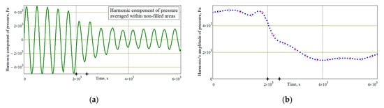 Figure 15 demonstrates a closing of the low resin filling region in the specified time interval. The state of the resin filling is illustrated in Figure 16a, whereas the change of the averaged pressure in the partially filled regions surrounded by the resin volume fraction Vr = 0.5 is present in Figure 16b. One can see in Figure 17 how the harmonic component’s amplitude of the pressure drops sharply during the separation of the closable region from the rest of the unfilled volume, in which the amplitude of the pressure oscillations is kept constant according to Equation (18). Such monitoring is performed during simulation, and it can signal the formation of potentially dangerous dry areas. Of course, the sensitivity of such a registration method depends on the magnitude of the closable volume: the larger this volume, the greater the change in the average amplitude of the pressure oscillations. Attention should also be paid to a sharp decrease in the vent’s air flow rate shown in Figure 18, which can also serve as an additional source of information about the formation of a possible dry spot.