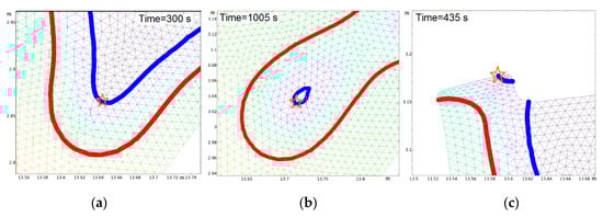 It can be explained by the real diffusion of the resin as well as by the mobility , which determines the time scale of diffusion in the Cahn–Hilliard equation (Equation (4)). Estimation of the actual magnitude of this mobility presents significant difficulties, but the occurrence of such closed contracting areas indicates the possibility of the formation of dry spots. A similar phenomenon is observed when the outer front approaches the protruding corners of the preform contour (see times 600 s and 2800 s). This slow mixing of two phases on the surface of their contact is inherent for all interacting systems. In real infusion processes, such mixing is constrained by an increase in air pressure inside the contracting empty area and a gradual increase in the viscosity of the resin over time under the influence of temperature due to polymerization. A detailed analysis, which is able to confirm or exclude the formation of an empty area in the real infusion process, can be performed using the algorithm processing the simulation results described below. Some justified guess-works can be made during simulation, which is very important when each simulation is controlled by an optimization algorithm that carries out the multiple calls of the forward problem with changed process conditions. Such guess-works should exclude from consideration potentially “dangerous” situations that contribute to the formation of dry spots.