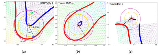 Determination of the filled nodes that surround the considered one at the time when it starts filling. The situations in the pictures (a–c) correspond to the same typical ones in Figure 20.