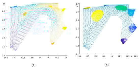 For these found nodes, their environment with filled nodes is determined and the identification of the arisen dry “traps” is made during the following steps (see Figure 21). Then, a sorting all the trapped nodes and identifications of the dry spots separated from each other is performed. Figure 22a demonstrates these separated spots, which are depicted by bold dots of various colors, and each dry spot is highlighted in its own color. Reconstruction of the closing resin front shapes (the original contour of the closing unfilled area) is performed by the analysis of for all nodes belonging to the selected spots. These original contours of all closed spots are shown in Figure 22b at the time instants of their closing.