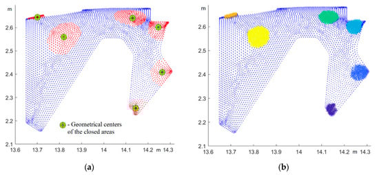 In order to estimate the changes for these closed unfilled areas and their volumes, two assumptions are accepted. The first is that the air in the closed areas obeys the gas law at the constant temperature , and the second is that the contraction of such areas occurs around their geometric center. Therefore, the centers of the spots are determined, as highlighted in Figure 23a, and then each area shrinks into a rounded shape so that the pressures inside and outside are equalized (see Figure 23b). At these contraction deformations, a change of the nodes number inside the spot is calculated. The results of these two final steps of the algorithm are shown in Figure 23.