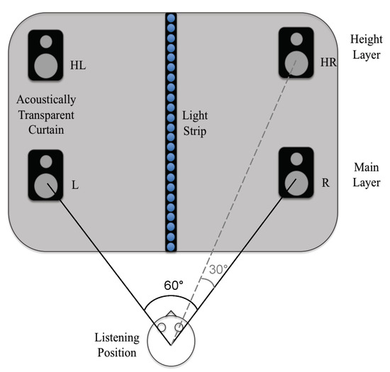 The physical setup of the experiment was identical to the author’s previous VLT study while using natural sources [9]. The experiment was conducted in an ITU-R BS.1116 [18]- compliant critical listening room (6.2 × 5.2 × 3.5 m; RT = 0.25 s; NR = 12) at the Applied Psychoacoustics Lab of the University of Huddersfield. Figure 1 shows the loudspeaker configuration for the experiment. The loudspeakers were arranged in a vertical quadraphonic configuration that was based on the front part of the Auro-3D 9.1 loudspeaker format [2] (without the centre channel). The L and R loudspeakers, which had the horizontal base angle of 60°, were raised at the listener’s ear height (0° elevation). The HL and HR loudspeakers in the height layer were placed right above the L and R loudspeakers and elevated at 30° from the listener position. The loudspeaker positions also comply with recommendations in ITU-R BS.2152 [19]. The distance between the listening position and each of these loudspeakers was 2 m. The direct-to-reverberant (D/R) energy ratios were 7.7 dB and 6.5 dB for the L and HL loudspeaker, respectively, when measured while using an omni-directional microphone at the listening position. Furthermore, within 15 ms after the direct sound, there was no reflection that exceeded −14 dB when compared to the direct sound level, which meets the requirement of ITU-R BS. 1116. Therefore, it can be considered that the influence of reflections on the perception of VIC would be minimal.