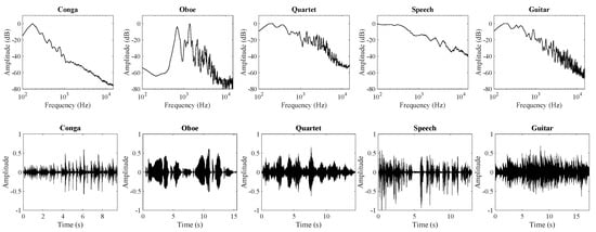 The experiment used five natural sound sources of conga, oboe, quartet, speech, and guitar, all of which were anechoic recording excerpts that were taken from [20]. They were chosen due to their varied spectral and temporal characteristics, as shown in Figure 2.