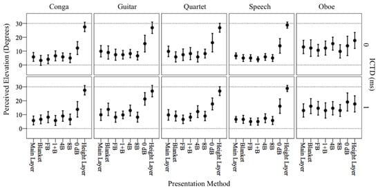 The rationales for the 4B and 8B conditions are as follows. Previous work by the present authors [9] suggest that there might be some perceptual dominance of the 7–9 kHz region in determining the VLTs for complex sources. Furthermore, in the literature it has been reported that the primary cues for elevation perception lie in the 4–10 kHz range [21,22]. More specifically, 8 kHz is related to ‘above’ perception, according to Blauert’s directional band theory [14], and therefore it is hypothesised that the band that is centred at this frequency would have a major influence on the perception of image elevation. The 4 kHz band is mapped to ‘front’ localisation by Blauert. However, in a phantom image condition, which is the case in the present study, Lee [23] showed that, with a pair of loudspeakers elevated at 30° from the listener’s ear position, a 4 kHz octave band noise was perceived to be elevated at the same height as the loudspeakers, due to the phantom image elevation effect [24,25]. Therefore, by reducing the energy of this band in the height layer, the perceived elevation of a phantom image that results from the vertical quadraphonic reproduction might be reduced. The 1 + B condition was created while considering a potential benefit of maintaining the original low frequency energy in the height layer signals captured using omni-directional microphones, whilst reducing all of the high frequencies that are potentially problematic for accurate localisation. In addition, the main and height layer only conditions as well as the blanket and 0 dB ICLD conditions were included to serve as references.