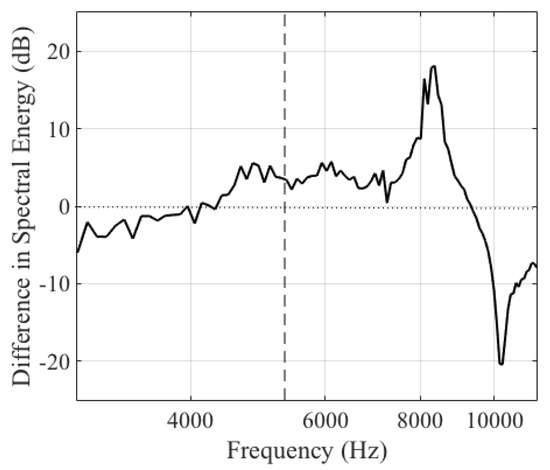 Consideration was first given to the discussions regarding the mechanisms that might determine the VLTs for complex sources in order to explain the effectiveness of the 1 + B, 4B and 8B methods. The difference in ear-input spectral energy of the height layer to the main layers the vertical quadraphonic condition was measured while using HRIRs that were obtained from the KEMAR dummy head database in order to gain further objective insights into this result [31]. The result is shown in Figure 4, in the range of frequencies covered by the 4 and 8 kHz octave bands (2840–11360 Hz). Any point where the difference is above 0 dB represents the dominance of the height layer over the main layer, and vice versa. From the figure, it can be observed that the height layer has considerably more energy in the 7–9 kHz region when compared to the main layer. Given that 8 kHz 1/3-octave band has an association with above localisation, according to Blauert’s directional band theory [14], it is reasonable to suggest that the large energy dominance in the 7–9 kHz region would result in the vertical phantom image condition being elevated with respect to main layer only presentation. By extension, this would also mean that providing sufficient attenuation of the phantom image in this range would result in the VLT being met, which seems to explain why the 8B and 1 + B methods were effective. In either case, the methods would necessitate the attenuation of the 8 kHz octave band by a minimum of 6 dB for transient sources and 10–13.5 dB for continuous sources, based on the listening test results (depending on the ICTD, see Table 1).