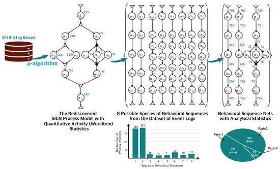 The behavioral analysis functionality illustrated in Figure 6 and devised in Algorithm 2 is able to produce a set of behavioral sequence nets from the rediscovered SICN/XPDL process model. Our emphasis is placed on the quality analysis of rediscovered process model by using the proposed concept and its algorithm. That is, the behavioral analysis aims at improving the quality of the rediscovered process model. Thus, naturally the following questions are raised: what is the quality of a process model? How can we evaluate the quality of a process model? This paper tries to answer those questions through the concept of behavioral sequence nets supported by the functional integration of the process mining and the process analyzing functionalities. We would insist that the quality of a rediscovered process model be defined by the degree of the discrepancy between the discovered process model as it is built by the Buildtime subsystem and the rediscovered process model as it is rediscovered by the Miningtime subsystem. The discrepancy, as you can easily imagine, is caused by disjunctive and conjunctive process patterns presented on the corresponding process model. The number of disjunctive process patterns on the model will affect the number of mutually exclusive behavioral sequences, whereas the number of the conjunctive process patterns on the model will affect the number of mutually inclusive behavioral sequences. Additionally, the statistical measurements related to the behavioral sequences play very valuable role in evaluating the quality of the rediscovered process models.