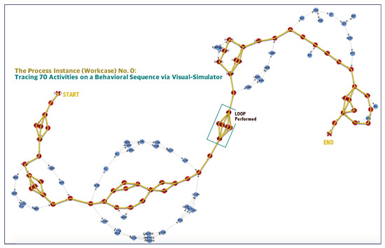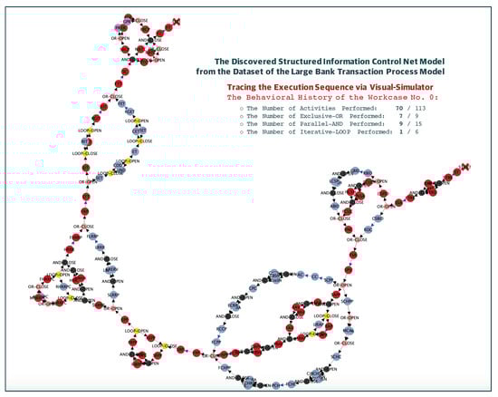 Based upon the Algorithm 2 and the formal concept of the behavioral sequence nets, the interactive and visual tracing functionality of behavioral sequences is implemented in the process analyzing subsystem. Therefore, the second experimental validation of the behavioral analysis aspect is carried out on the Experimental Dataset 1. Figure 14 is a captured screen of the process analyzing subsystem, on which the rediscovered SICN process model is displayed and the user is able to visually trace a behavioral sequence in an interactive fashion. In the figure, those red-colored circles represent the business activities that are already traversed during interactively running the behavioral sequence tracing session. Additionally, it supports displaying the structural statistics on the behavioral sequence traced; the behavior sequence (i.e., process instance ID, number 0) involves 70 business activities out of 113 business activities; the numbers of disjunctive exclusive-OR, conjunctive parallel-AND, and repetitive iterative-LOOP constructs involved are 7, 9 and 1, respectively.