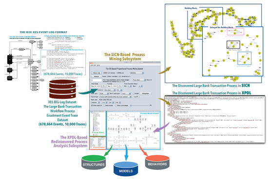 This section describes the implementation details of the integrated functional architecture designed in the previous section. The major systematic framework is made up of a structural analyzer and a behavioral simulator with a process instance tracer, and these are operable on those rediscovered SICN and XPDL process models from the process enactment event log datasets by the process mining approach developed in this paper. Figure 8 illustrates the concrete systematic framework of the functional integration of the process mining and the process analysis and its experimental results with a specific dataset. As shown in the figure, the process mining functionality was integrated with the process analyzing functionality through seamlessly sharing the XPDL process models transformed from the rediscovered SICN process models. The figure uses a series of captured screens produced through one of the experiments described in the next section. The dataset is in the IEEE XES standardized log format and contains 678,864 event logs recorded from enacting 10,000 workcases (i.e., process instances) of the large bank transaction process model; from the dataset, the process mining subsystem rediscovers the structured information control net process model consisting of 113 activities and their occurrences, and the process analyzing subsystem produces the textual form of the rediscovered XPDL process model; by analyzing the rediscovered XPDL process model, the process analyzing subsystem eventually validates the structural properness and the behavioral properness of the rediscovered process model characterized by the very large scale and massively parallel structural properties.