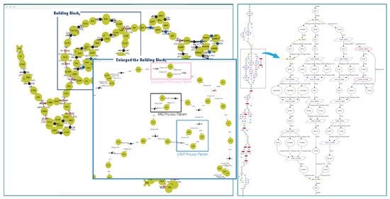A (business) process management system (BPMS) is defined as a system that fully automates the definition, analysis, deployment, execution, and monitoring and controlling of work procedures in a process-aware enterprise. One of the essential components of BPMS is the modeling subsystem (Buildtime) that is substantially supported by a graphical and formal methodology of the process model. The conventional modeling subsystem is equipped with a series of functional components supporting everything from the modeling of a process model with graphical notations to analyzing and deploying it onto the enacting subsystem (runtime). In recent times, keeping abreast of the process mining [1,2] with the emerging concept of enterprise big data, the advanced BPMSs have begun to be furnished with the process mining functionality [3] as an essential subsystem (Miningtime). In other words, the time of process reengineering and redesigning has truly come in process-aware enterprises and organizations. This atmosphere booming process redesigning and reengineering is becoming a catalyst for triggering the emergence of the concepts of process mining and process-centered knowledge mining that rediscover several perspectives of processes, such as control flow, data flow [4], resource allocation planning [5], social and organizational perspectives from their execution histories, and traces collected at runtime. In consequence, the time of functional integration of the rediscovery functionality of the Miningtime subsystem and the analysis functionality of the Buildtime subsystem ought to be coming. Actually, the motivation and necessity of this functional integration came up with a couple of experimental validation studies of the process mining algorithm. Note that one of the minded process models is made up of 624 business activities and so it is almost impossible to fulfill any further meaningful analytical work due to the huge number of activities.