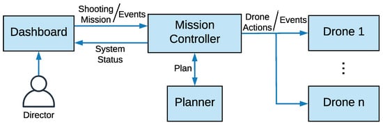 General scheme of the system architecture. The director defines shooting missions with the Dashboard and sends them to the Mission Controller. This Mission Controller uses a Planner to compute plans that are then sent to the drones. During the execution of the plan, the Mission Controller sends events to the drones to trigger actions and reports periodically to the Dashboard about the execution/system status.