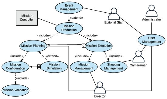 Figure 2 shows the use case breakdown of the Dashboard. The roles involved in the process include both human actors and machine system components (shown, respectively, as man icons and gray rectangles in Figure 2). The director is responsible for defining, leading, and coordinating the editorial shooting missions. The role of the cameramen is to operate the cameras on board the drones, thus replacing their autonomous operation when necessary due to production requirements. The editorial staff deals with the data entry of events, possibly organizing them hierarchically in sub-events. The system administrator is responsible for effective provisioning, configuration, operation, and maintenance of the Dashboard.