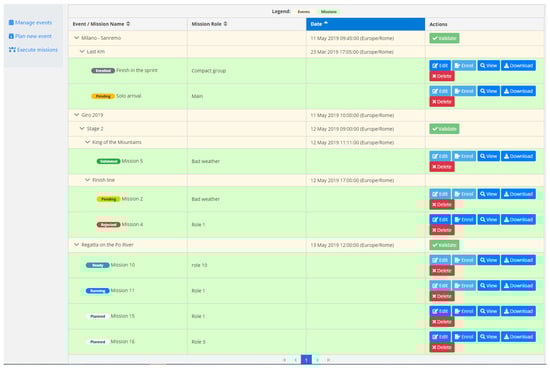 Once the user is logged into the system as a director, the homepage with the list of created missions is presented (see Figure 3), together with the related events, role of the mission, and date of the event. The status of each mission is also shown, so that the director may know the next steps of the planning or execution workflows that can be taken for every mission. For example, if a mission is in “Pending” status, it means that the director requested to validate the mission, and the Mission Controller is performing the required safety and security checks. Several actions can be performed from this page, as editing a mission or deleting it. The deletion of a mission implies the deletion of all the content of the mission itself (i.e., any related shooting action sequences and shooting actions). On the left side of the homepage, a menu allows the director to be redirected to the event management section, a specific page of the Dashboard used to manage already created events. Through this menu, the director has also access to the page for creating new events, and to the page for executing validated missions.