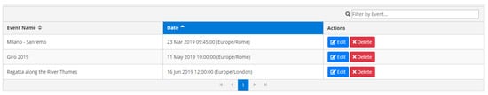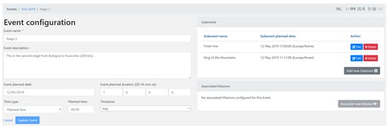 The event management page shows both information on already created events, such as their planned date and time, and available actions to be performed on single events (i.e., edit and delete). An example is shown in Figure 4. If the director or the editorial staff need to create new events, they can select the “Plan new event” item on the left menu of the director home page. This action will redirect to the event configuration page, where a form containing information about the new event can be filled in and then saved on the database. For each event, users can create new child events or new missions. Figure 5 illustrates an example.