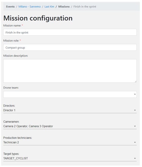 Once the hierarchy of events has been created, missions for leaf events (i.e., events with no more children) can be configured. Figure 6 shows an example. The event is the shooting of the last kilometer of the “Milano-Sanremo” cycling race. The mission is called “Finish in the sprint” and it will be executed in case of a sprint finish of the race. The crew enrolled in the mission includes four people: one director, two cameramen, and one production technician.