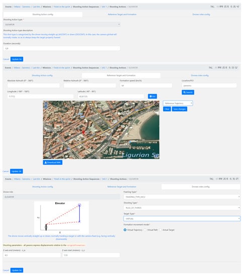The mission configuration page also shows, if present, a list of SASs related to the mission. The user can either add new SASs or update existing ones by simply filling in a short web-form. For each SAS, the user can add one or more shooting actions, detailing through appropriate web forms what the drone formation will do during the live event and what each single drone will do as well. Three tabs, as shown in Figure 7, compose the shooting action configuration page. The first tab describes the main metadata of the shooting action, like the duration. The second tab allows the user to fill in information about the drone formation. This includes, for example, the RT trajectory on a map and the speed of the formation. The third tab collects specific information about each shooting role in the drone formation, such as the shooting parameters (e.g., drones’ displacements), framing types (e.g., long shot, medium shot, close-up shot, etc.), and shooting target.