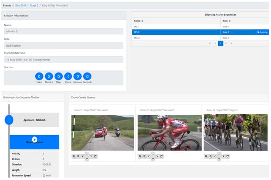 Once the plans for a shooting mission have been computed and validated, the director can select any valid combination of mission and SAS roles to execute. This is done by triggering a “run” command from the Dashboard, which will notify the Mission Controller to start the selected missions/SASs. The execution of a selected SAS can be monitored in real-time through a dedicated page of the Dashboard, as illustrated in Figure 8. The page shows information about the corresponding mission, including mission metadata (e.g., name, role, date, and a countdown timer), and associated SASs. Selecting a SAS will show the corresponding timelines with the shooting actions involved, as well as the video streams coming from drones cameras, when available. Furthermore, for each drone, a console to manually adjust camera parameters (i.e., gimbal orientation, zoom level, and focus) is shown.