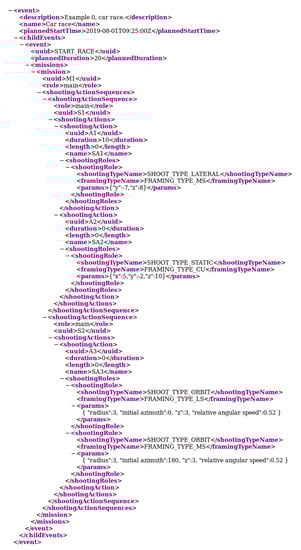We use a vocabulary that the editorial team can understand and define an XML-based dialect to write shooting missions. In the following, we explain the structure of the XML files and how they can be converted into lists of tasks for autonomous drones. The complete XML schema is also publicly available (https://grvc.us.es/downloads/docs/multidrone_schema.xsd). Our XML schema to describe shooting missions has the following main information entities: