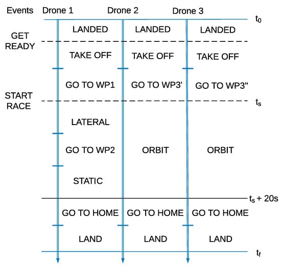 Recall that the mission consists of two shooting action sequences, one with a drone performing first a lateral shot (SA1) and then a static shot (SA2), and another with two drones performing an orbital shot together (SA3). In the simulation, the shooting target is simulated with a car following a straight road that the drones must track and film. Figure 10 depicts the timeline of the executed mission. Everything starts with the GET_READY event, which makes all drones take off and go to their corresponding waypoints. Then, the START_RACE event triggers both sequences. Finally, after 20 s, the drones come back to the home position and land.