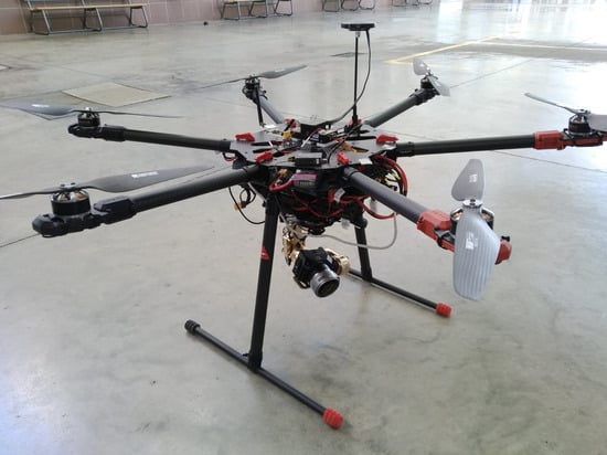After validating the system in simulation, we integrated our tools with custom-built drones to run media production on real outdoor events. Figure 13 shows one of our drones, based on an hexarotor platform (120 cm of diagonal distance) with a Pixhawk 2.1 autopilot running PX4 [24]. The payload consists of an Intel NUC computer, a Here + RTK GNSS, a communication board, and a gimbal with a Blackmagic Micro Cinema camera.
