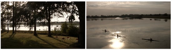 In particular, Figure 14 depicts some snapshots from an experiment where two drones have to shoot a rowing race in a lake. In that experiment, the original shooting mission consists of a lateral shot that runs concurrently with a fly-through followed by a static panoramic. The first shot is performed by one of the drones, which flies parallel to the boats over the yard. The other two shots are carried out by the other drone, which goes over the lake coming through the trees, and then keeps static following the rowers with the camera. In this case, one of the boats carries a GNSS receiver sending their position to the computers on board the drones, so that the gimbal cameras can track them all time as shooting targets. A video showing the whole shooting mission is available online (https://www.youtube.com/watch?v=COay0hZsMzk&feature=youtu.be).