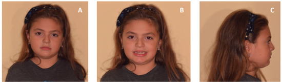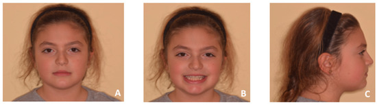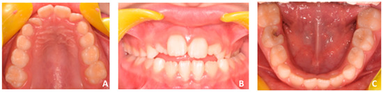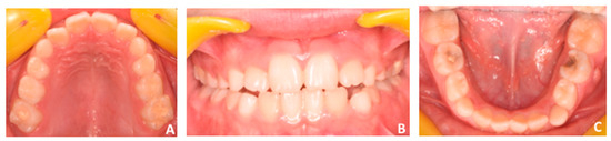 (A–C) Intra-oral examination. In particular, see the absence of crossbite at the right side (A) and the coincidence between maxillary and mandibular midlines (B).