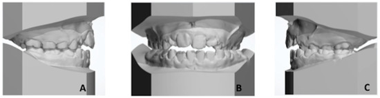 (A–C) Digital models in centric occlusion. (A) Right lateral view. (B) Frontal view shows the posterior crossbite at the left side with loss of coincidence between maxillary and mandibular midlines, due to a slight shift of the mandible toward the left side. (C) Left lateral view.