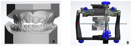 (A) Centric relation, with mandibular and maxillary midlines coincident, showing occlusal interferences leading to mandibular shift upon closure (see intra-oral images). (B) Digital articulator used to simulate centric occlusion of the patient in order to detect occlusal interferences.