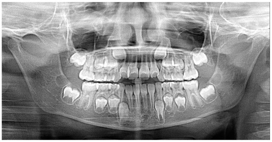 Panoramic radiograph showed the presence of all permanent dentition with no signs of ectopic eruptive pattern (Figure 5). We did not request lateral cephalogram considering the patient’s age and the absence of relevant clinical signs of skeletal antero–posterior discrepancies; thus, useless radiation exposure was avoided for the patient, according to the A.L.A.R.A. principle [20,21,22].