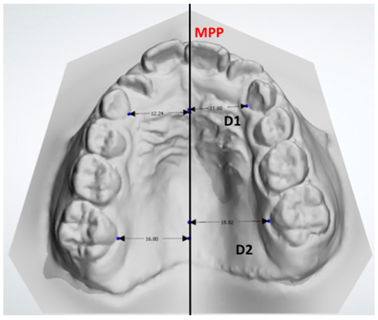 Median palate plane (MPP) drawn on digital maxillary dental arch. See also emi-linear measurements as distance between the MPP and primary canines (D1) and permanent first molars (D2) on both sides.
