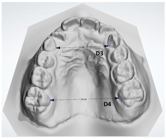 These measurements provide information about the transversal diameter of the maxillary arch (D3-D4) and about the emi-transversal diameters to identify potential linear asymmetry between both sides (D1–D2).