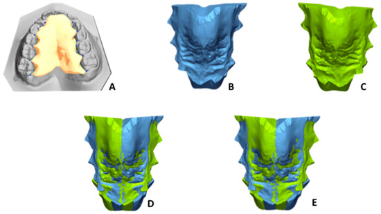 - Step 3. Final registration: Final registration was made using the “best-fit alignment” option in the Geomagic Control X software. The precision of the registration was set to at least 0.3 mm (tolerance type: “3D Deviation”) with a maximum of 100,000 polygons for surface representation. The corresponding polygons from selected reference areas were automatically superimposed (Figure 8E).