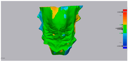 To date, progress in 3D imaging has opened new scenarios for the evaluation of anatomical characteristics and morphological changes in dentistry [7,8]. In the orthodontic field, for example, digital scans of maxillary and mandibular jaws can be registered (superimposition) and deviation analysis can be used to detect shape and to obtain detailed dimensional information. Moreover, 3D models of the maxilla and/or mandible of the same subject can be mirrored and superimposed in order to detect anatomical asymmetry as well as asymmetrical changes between two sides [9,10,11]. This information can be provided by referring to “surface-to-surface” analysis, and can be visualized in colors in a 3D color-map [9,10,11].