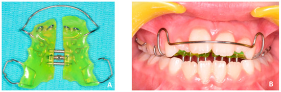 We decided to construct a maxillary removable mono-block with a built-in Hyrax screw and with an anterior grid that was extended 3–4 mm below the lower incisor’s marginal edge. This grid forced the tongue in a more physiologic position (backward and upward), with the tip of the tongue contacting the retro-incisal papilla (Figure 10 A,B). With the tongue in a more backward position, upper and lower incisor were left free to erupt facilitating the closure of the bite [25], without the application of orthodontic forces on these teeth. The screw was slowly activated, i.e., two times a week up to the clinical assessment of crossbite resolution and correction of mandible posture in centric relation, with both maxillary and mandibular midlines coincident.