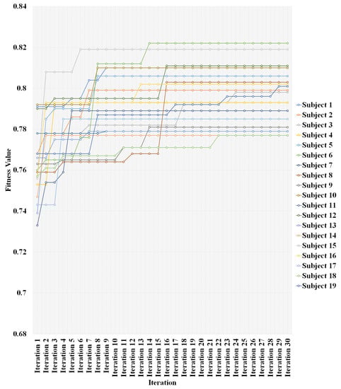 Initially, the value of r is 0 (line 1), the value of x is equal to the position of the particle p (line 2) and is an empty set (line 3). For each d from the set , if the value of is equal to 1 then the feature is included in the set of selected features (lines 4–8). The initial value of is 0 (line 9). For each activity a from the set of daily living activities the steps from (lines 11–23) are repeated. The initial values of and are equal to (line 11) and (line 12). For each feature f from the set of features , the values of and are updated in (lines 14–19) as follows: If the value of is less than the value of (line 14) then is initialized to the value of (line 15) and if the value of is greater than the value of (line 17) then is initialized to the value of (line 18). If (line 21) then the value of is incremented with (line 22). In (line 25) the value of r is updated using the formula: