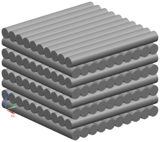 The material studied here was the UHMWPE fiber-reinforced polyurethane matrix laminate manufactured by the Ningbo Dacheng Advanced Material Co., Ltd. in Ningbo city, Zhejiang province of China. The area average density was 9.7 kg/m2. The thickness was 11 mm. The diameter of the fiber was about 25 μm. The density of the polymer matrix was around 1.1 × 103 kg/m3, and the volume fraction was around 20%. The structure of this laminate involved a layer of 0°-direction fibers covered by a layer of 90°-direction fibers, as shown in Figure 1. This structure is usually designed for stiff applications like helmets and panels [10]. Due to its cross-ply layup, the laminate is assumed to be orthotropic [22]. Therefore, the material properties of 0°- and 90°-directions were taken to be equal. As shown in Figure 1, the xc- or yc-direction was taken as the in-plane direction, whereas the zc-direction was taken as the out-of-plane direction.