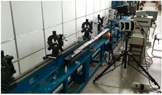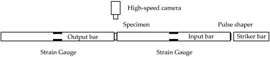 The Split Hopkinson pressure bar (SHPB) apparatus is widely applied to study the dynamic behavior in strain rates ranging from 100–10,000 s−1 [39]. Due to the different hardness in the out-of-plane and in-plane directions, steel bars and aluminum bars were applied, respectively. The values of density and Young modulus for the steel and aluminum bars were 7.85 × 103 kg/m3, 206 GPa and 2.8 × 103 kg/m3, 72 GPa, respectively. The striker bar had a length of 0.4 m for aluminum and 0.5 m for steel. The input and output bars had lengths of 1.5 m and 1.5 m, respectively. Their diameters were all 14.5 mm. In addition, a Φ10 × 1 mm copper thin circular slice and a Φ10 × 1 mm thin circular hard paper slice were used as the pulse shapers for the out-of-plane and in-plane compression, respectively. For each experiment, a fresh pulse shaper was used [22,40]. The recording of stress waves was performed using a pair of two half bridges that compensated for the bending effect of the bars [41], as shown in Figure 2. To reduce the non-uniform stress distribution due to friction [42,43,44], Vaseline was applied to the two contact faces of each specimen. The SHPB apparatus (Luoyang Liwei Technology Co., Ltd., Luoyang city, Henan province of China) is shown in Figure 3; a high-speed camera (Phantom V2511, Vision Research, Inc., Wayne, New Jersey, USA) was applied to record the morphology under high-strain-rate loading [18].