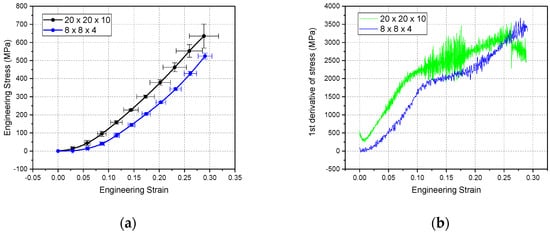 Two sizes of specimens were studied. The loading speed was 2 mm/min; thus, the strain rate for the 20 × 20 × 10 specimen was 3.37 × 10−3 ± 8.0408 × 10−6 s−1, and the strain rate for the 8 × 8 × 4 specimen was 8.31 × 10−3 ± 5.4029 × 10−5 s−1. Firstly, as shown in Figure 4a, the fracture stress of the bigger specimen was higher, while the fracture strain values of the two sizes of specimens were similar, i.e., 2.8861 × 10−1 ± 2.895 × 10−2 and 2.9064 × 10−1 ± 1.366 × 10−2, respectively. Secondly, as obviously shown in Figure 4b, there were two phases during the loading. The first phase possibly represents the compact procedure, where the pores among the specimen were compressed outward. The second phase possibly represents the bearing procedure, where the fibers began holding the load. The bigger specimen could hold the loading more stably, and it seems that the bigger specimen became stable more quickly during the first phase. As shown in Figure 4a, the compressive strength of the 20 × 20 × 10 specimen was 634.8947 ± 66.3778 MPa, which is similar to the compressive strength of ~650 MPa in Reference [4] using the same size of specimen.