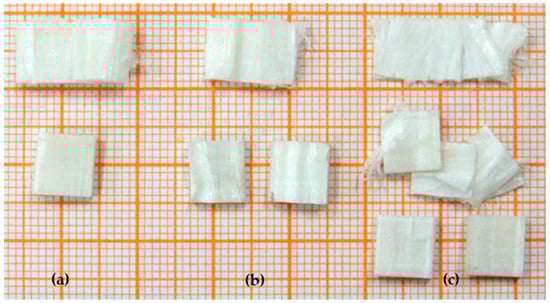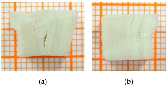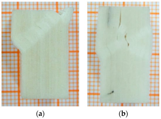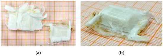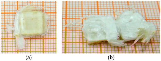 As shown in Figure 5, the specimens had a shear failure feature. As shown in Figure 5a and Figure 6a, many fibers were squeezed out along the four edges of the specimen and, thus, a little square was presented at the center of the surface. Therefore, an inner shear generated in some places, which resulted in the fibers being cut off as shown in Figure 5b and Figure 6b. Another feature is that, when failure occurred, there was always a loud popping sound like an explosion, and the pieces of fibers splashed all over the place.