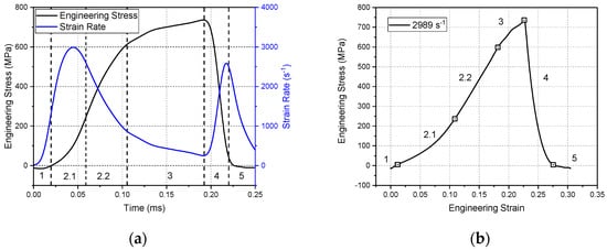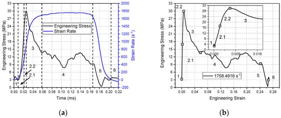 Evolution of the stress and strain rate curves of damaging test under out-of-plane loading: (a) stress and strain rate vs. time curves; (b) stress vs. strain curve.