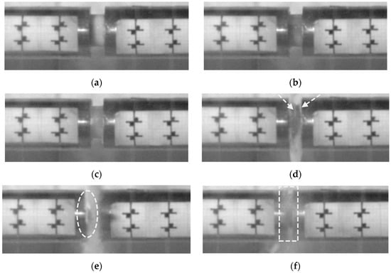 The failing process of the specimen under out-of-plane loading: (a) 0 μs; (b) 20.8 μs; (c) 31.2 μs; (d) 56.16 μs; (e) 126.88 μs; (f) 520 μs.