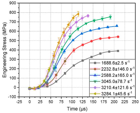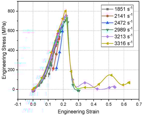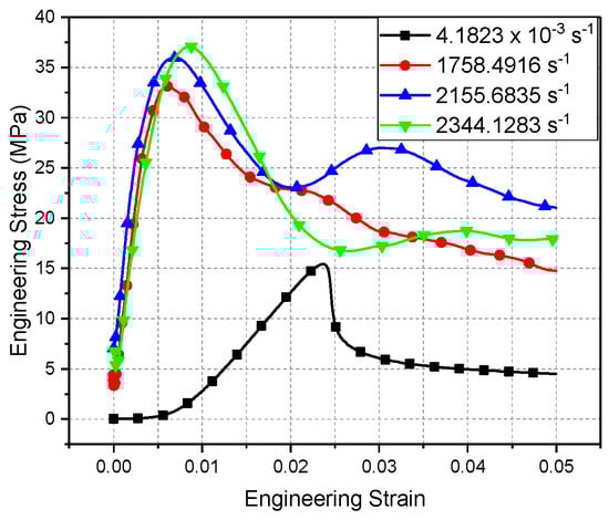 If the specimen was not damaged completely, the peak stress refers to the maximum stress that the specimen could sustain under a certain strain rate. After the peak point, the specimen still had the ability to spring back, which could also be seen in the high-speed camera records. However, the spring-back curve was not the same as the loading curve. This was potentially because some fibers were squeezed out of the main body of the specimen and, thus, a certain degree of permanent damage was caused. Furthermore, the slopes of previous spring-back curves under different strain rates were similar [49], which means that the specimens retained similar properties.