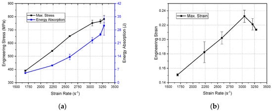 The changes in material properties of the Φ9 × 4 specimens with increasing strain rate: (a) max stress and energy absorption vs. strain rate curve; (b) max strain vs. strain rate curve.