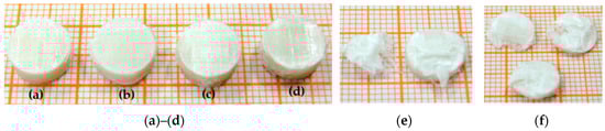 The morphological differences of Φ9 × 4 specimens under increasing strain rate (s−1): (a) 1666.6250 ± 2.5290; (b) 2232.7599 ± 146.0478; (c) 2588.1668 ± 164.9590; (d) 3045.0018 ± 78.6690; (e) 3210.3948 ± 121.6243; (f) 3284.0803 ± 45.5605.