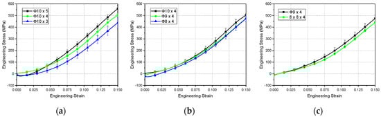 The stress–strain curves of different specimens: (a) effect of thickness; (b) effect of diameter/area; (c) effect of cross-section shape.