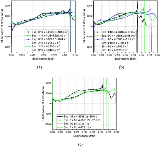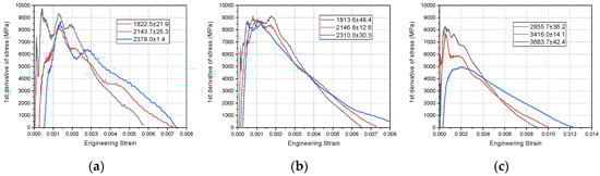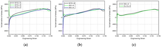 The first derivative of stress–strain curves of different specimens: (a) effect of thickness; (b) effect of diameter/area; (c) effect of cross-section shape.